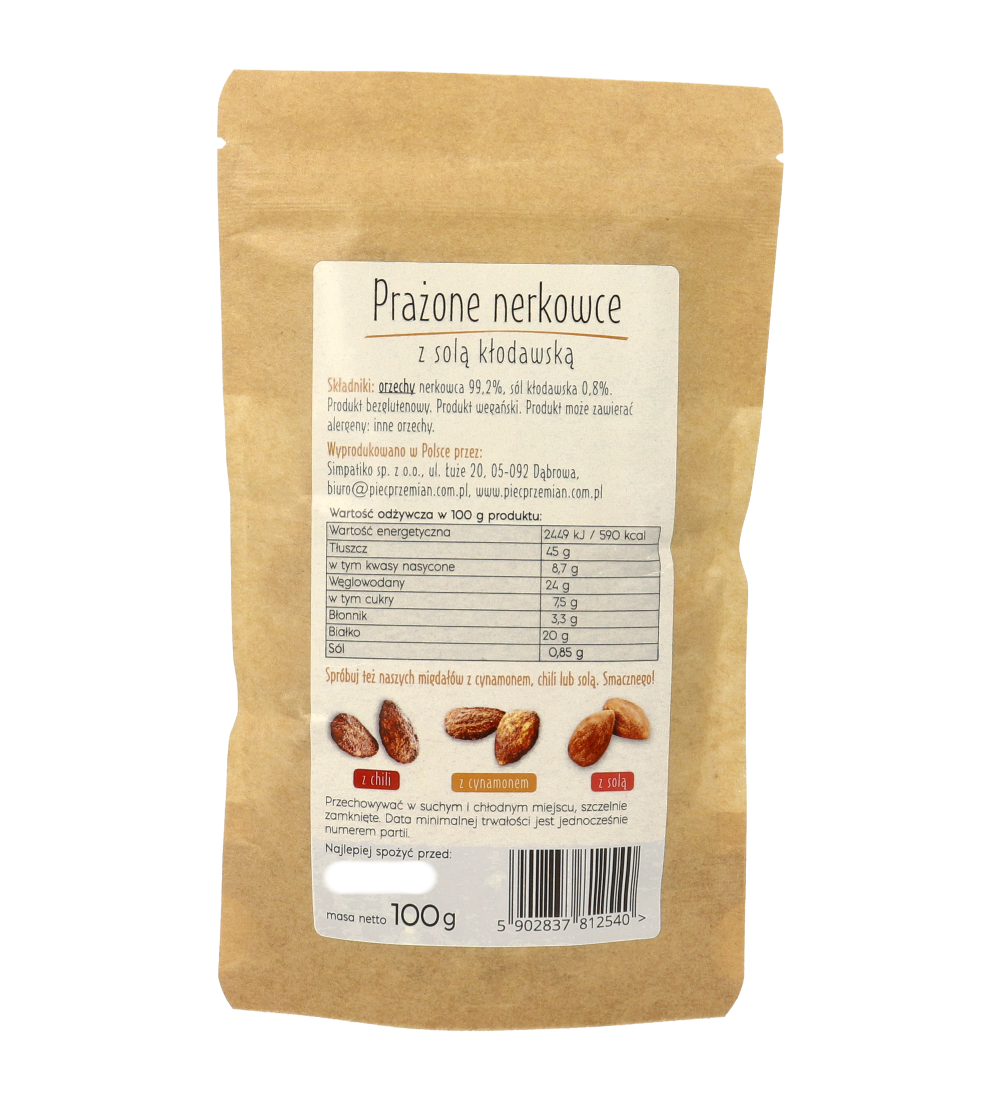 Składniki: orzechy nerkowca hiszpańskie 99,2%, sól kłodawska 0,8%.