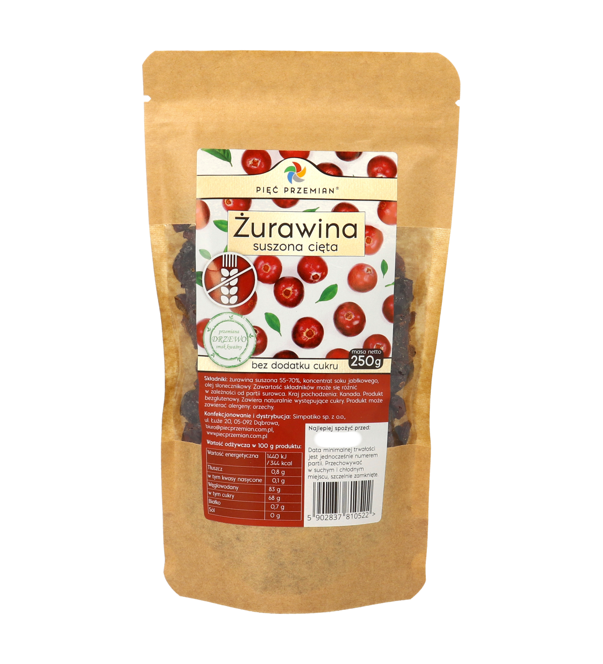 Składniki: żurawina suszona (55-70%), koncentrat soku jabłkowego, olej słonecznikowy. Zawartość składników może się różnić w zależności od partii surowca.